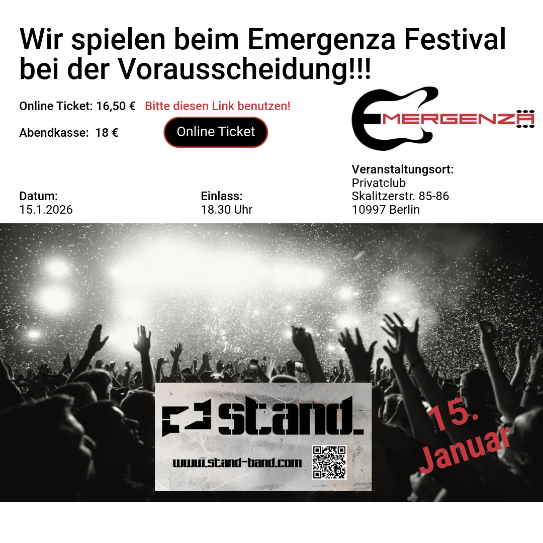 Wir sind Stand., eine Berliner Rockband, die sich 2024 gegründet hat. Unsere Liebe zur Berliner Musikszene prägt unseren Sound. Wir stehen für selbstkomponierte, kraftvolle Rockmusik mit einer markanten, charakteristischen Stimme.